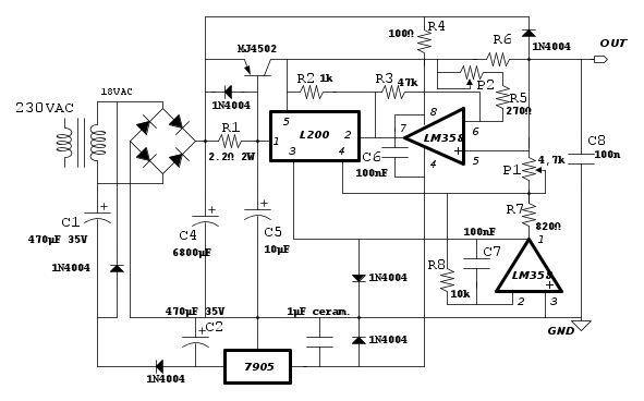 Aggiungerei anche un diodo dal piedino 3 dell'L200 a massa, così la tensione in quel punto non salirà mai troppo anche se l'operazionale o l'alimentazione negativa non fosse ancora a regime o si guastasse. Cortocircuitare a massa (anche attraverso un diodo) l'uscita dell'LM358 non dà problemi perché questo integrato lo sopporta (anche per tempo indefinito).