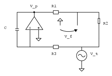 sarebbe negativo o positivo a seconda della frequenza (considero che A sia infinito ad ogni frequenza). Problema: ma quale frequenza? Nel circuito non c'è un generatore di segnale, il che mi fa sospettare che questo sia una sorta di oscillatore. Ma allora l'operazionale di destra dovrebbe comportarsi da comparatore, fuori linearità...insomma, non ci sto capendo niente
