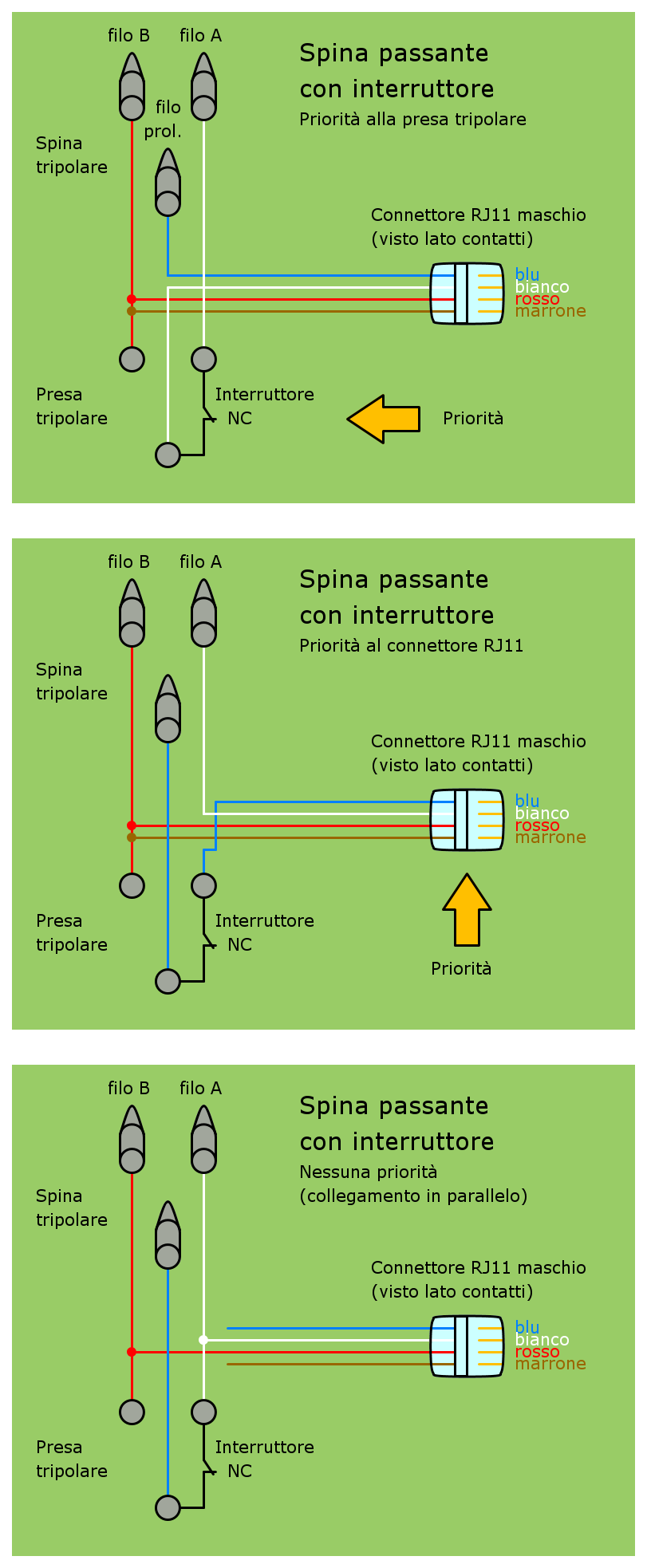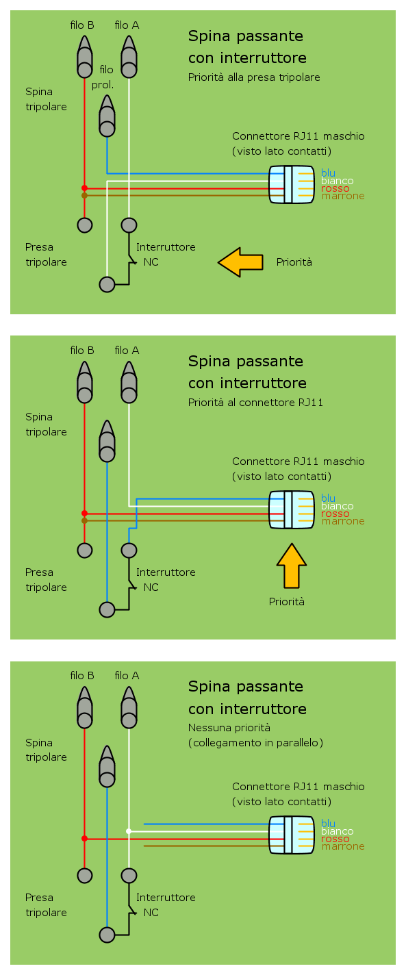 Il terzo spinotto non è altro che il prolungamento del filo A (bianco) per le successive prese telefoniche a minor priorità. È utilizzato solo se l'impianto interno ha il collegamento delle prese in catena o "in serie". Se l'impianto è collegato in parallelo, non viene utilizzato.