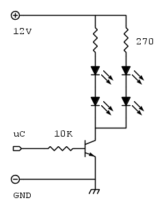 Ovviamente 4 diodi così con 12V non si accenderanno mai, si potrebbero mettere a due a due in serie ad una resistenza da \frac{12-(3.3 \times 2)}{20 \times 10^{-3}}=270 \Omega e collegati tra +12V e collettore.