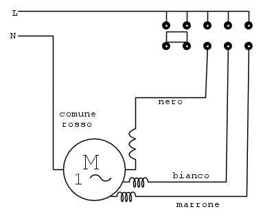 e il relativo interruttore commutatore a slitta tipo questo il motore e ' un motore a tre velocita' con il rispettivi colori :Rosso Comune,Nero 1'Velocita,Bianco 2'velocita',Marrone 3'velocita' il vecchio motore aveva 4 fili anche lui,ma di colore diverso Bianco-nero-rosa-celeste del quale non conosco il comune.C'e' qualcuno che per cortesia mi puo' aiutare a fare i collegamenti giusti .Grazie ancora in anticipo per la cortese attenzione .