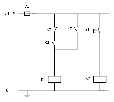 il contatto di NO di Q2 in derivazione al pulsante di stop S1, lo bypassa quando Q2 è eccitato pertanto controlla lo stato di stop di Q1 anche lo stato di Q2, viceversa vale il discorso per il contatto NC di Q1 in derivazione sul pulsante di stop S3