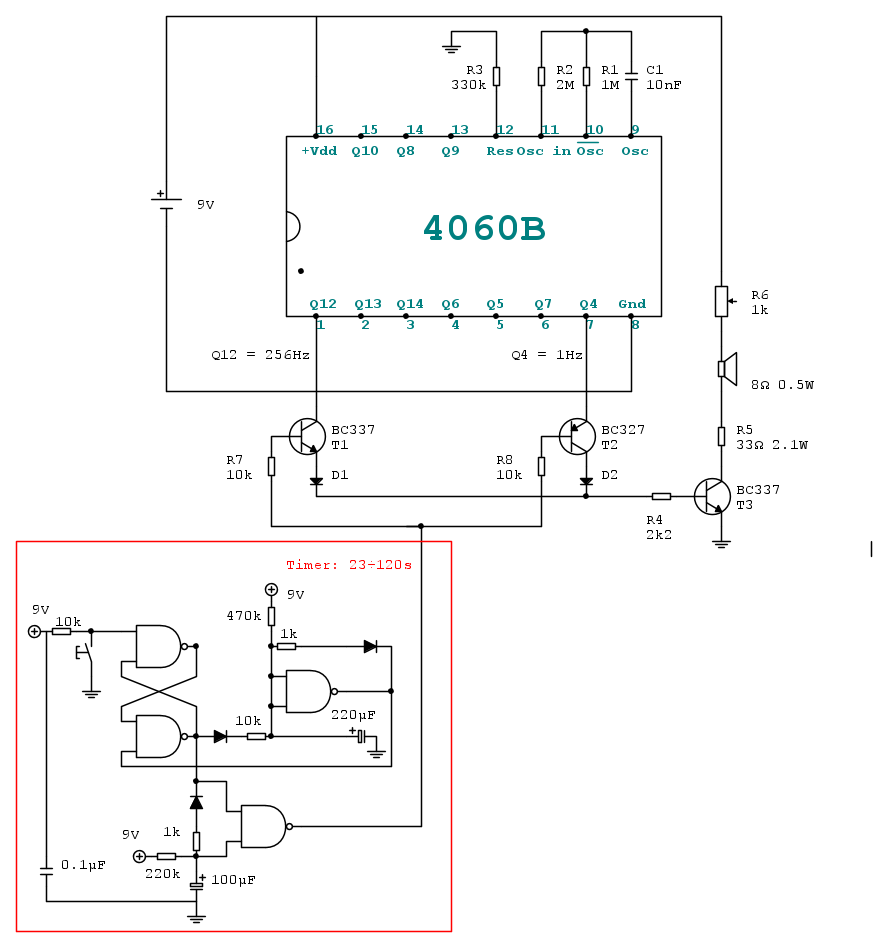 Il circuito funziona come era mia intenzione, cioè durante il periodo di temporizzazione ON lo speaker produce un ticchettio alla frequenza di circa 1 Hz e quando il tempo scade lo speaker genera un suono a circa 256 Hz (una specie di sirena).