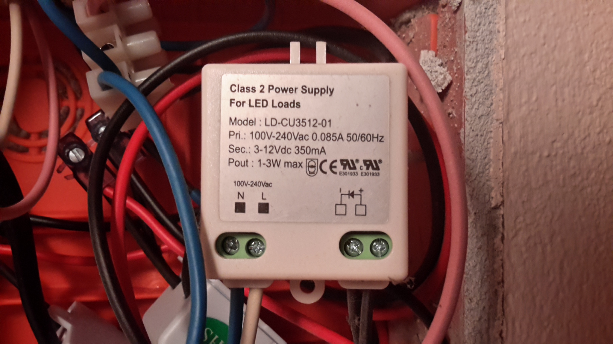 Allego la scheda tecnica dei tre led e le foto degli alimentatori, che si trovano entrambi in un'unica cassetta di derivazione.....tengo a precisare che, siccome nella stanza ci sono altri due led (sopra la doccia) di maggior potenza rispetto ai tre led delle nicchie, ho fatto le foto a tutti e due gli alimentatori, ma quello che si riferisce ai tre led non funzionanti è l'alimentatore contraddistinto dal numero LD-CU3512-01