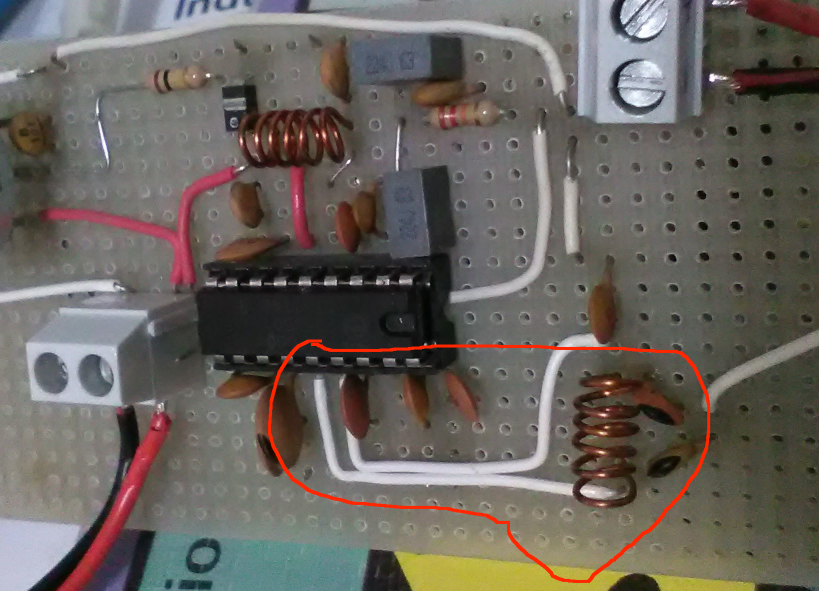 I collegamenti "cerchiati in rosso" nella figura che ti ho postato erano per farti capire il problema nel tuo montaggio millefori. Non serve uno stampato basta che riposizioni la bobina il più vicino possibile all'integrato eliminando i fili bianchi, tutto lì.