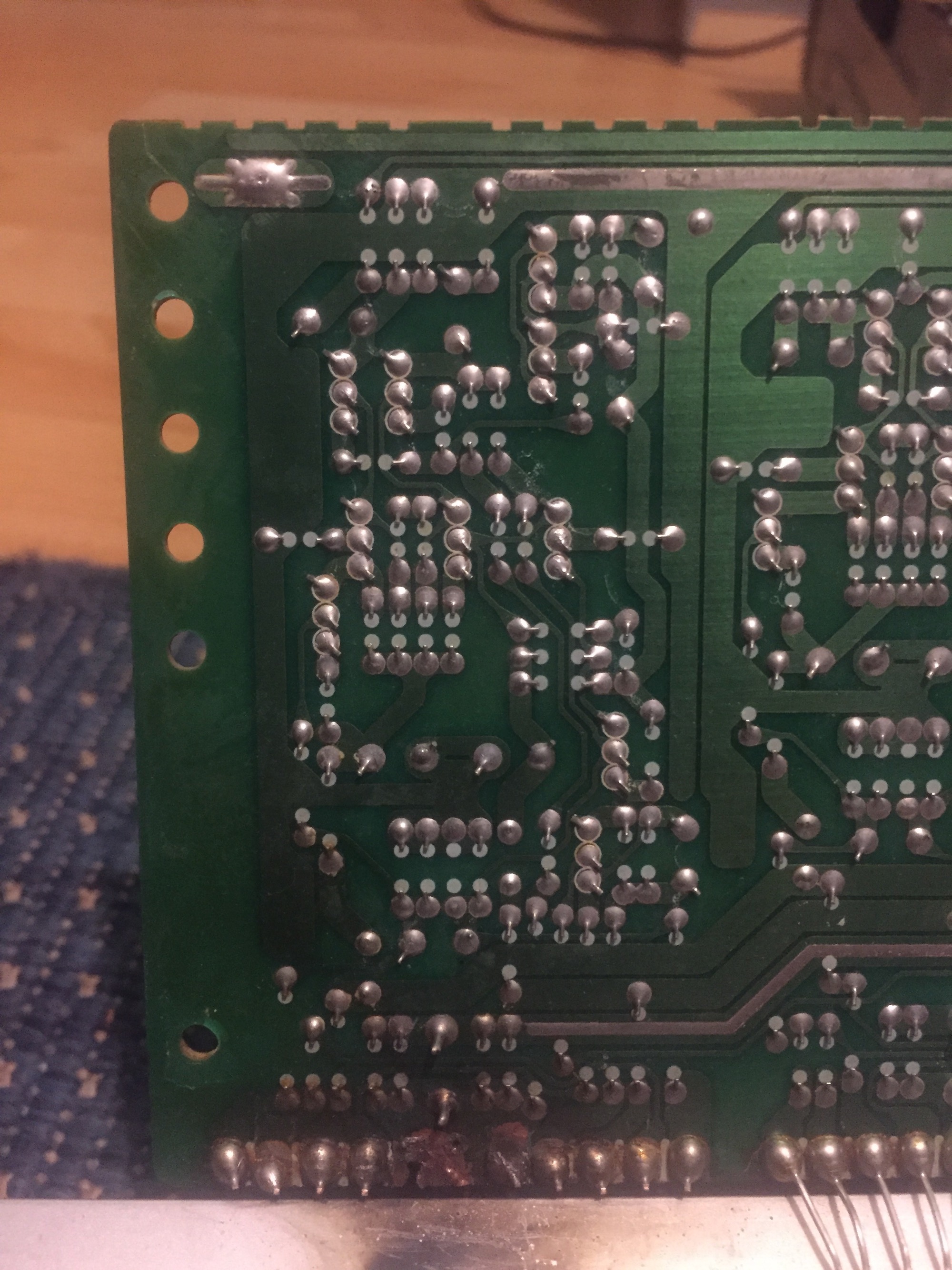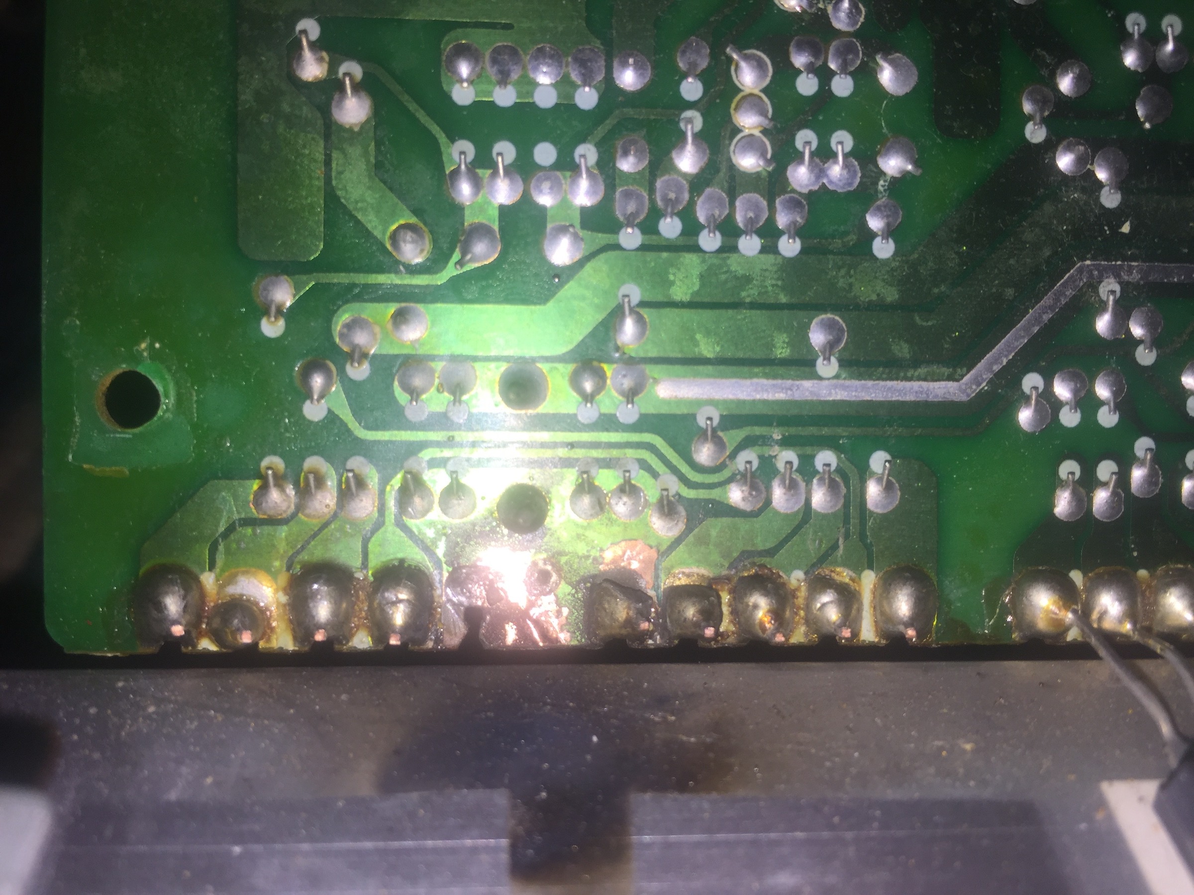 Ecco le foto che mi avete chiesto. Non ho trovato cortocircuiti, neanche nel punto che sembra bruciato/sciolto. Ho testato tutti i condensatori (nessuno è in corto) e i transistor danno le stesse tensioni di soglia dei loro compari sugli altri canali. I 6 finali dei 6 canali sembrano identici, hanno gli stessi identici componenti.