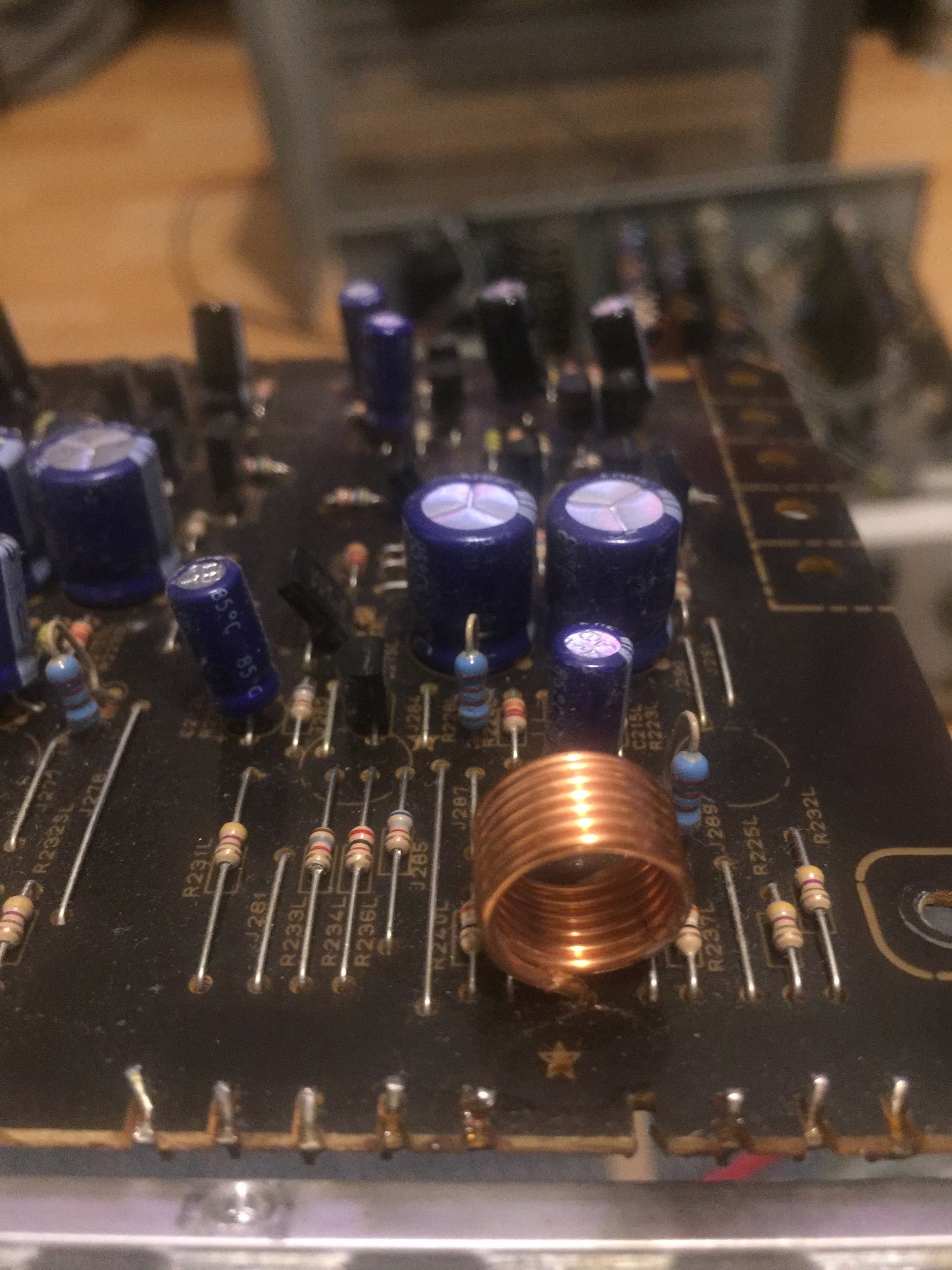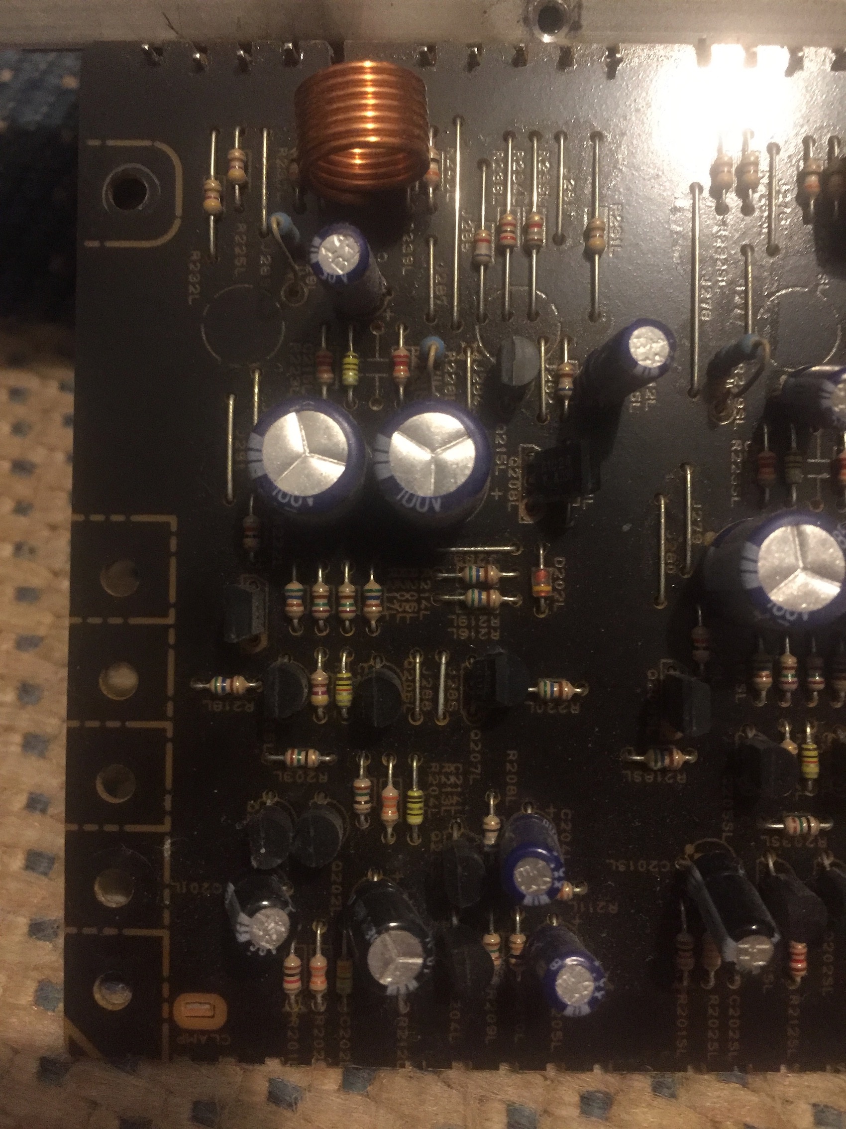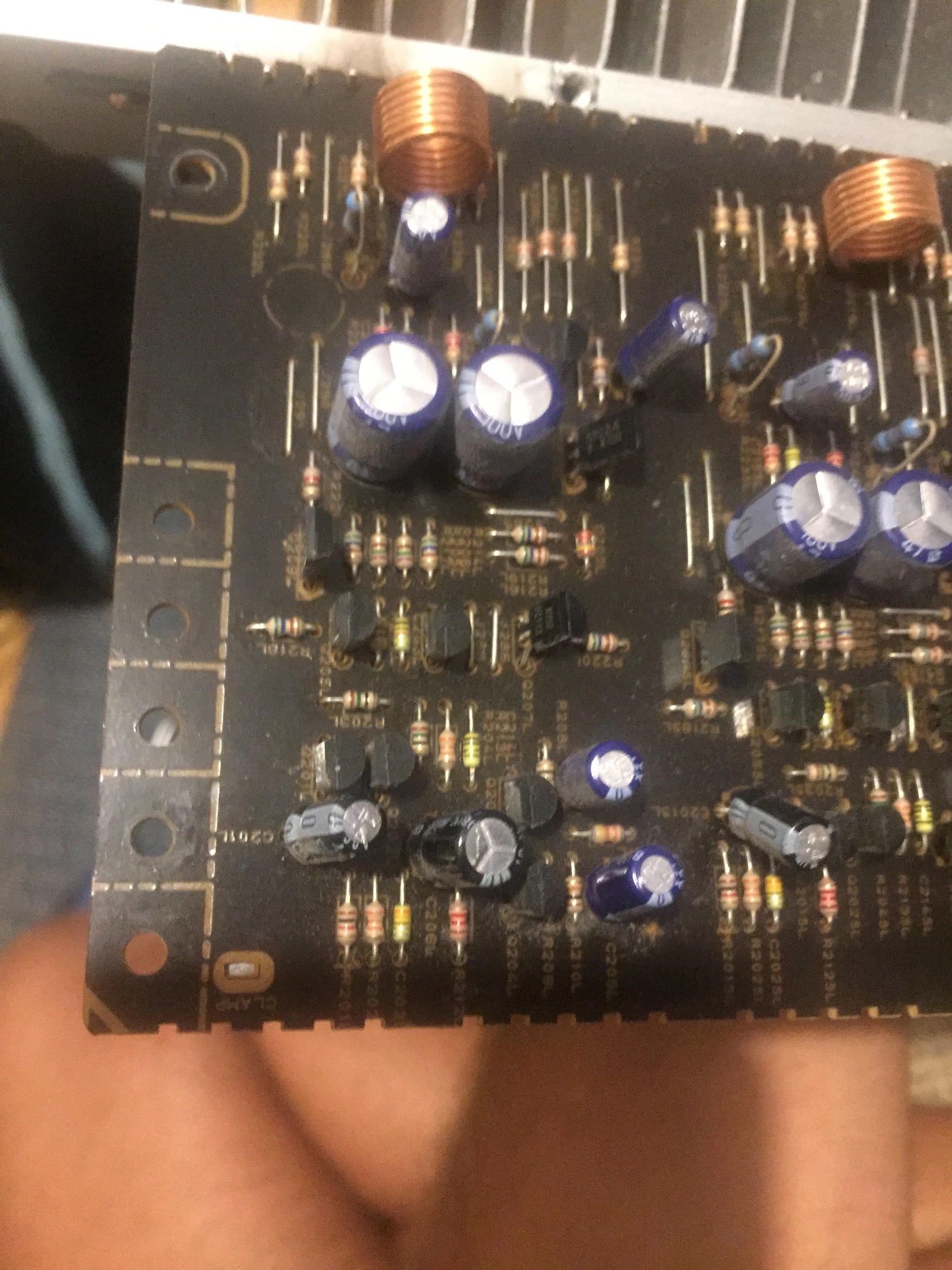 Luca1995 ha scritto:Ecco le foto che mi avete chiesto. Non ho trovato cortocircuiti, neanche nel punto che sembra bruciato/sciolto. Ho testato tutti i condensatori (nessuno è in corto) e i transistor danno le stesse tensioni di soglia dei loro compari sugli altri canali. I 6 finali dei 6 canali sembrano identici, hanno gli stessi identici componenti.