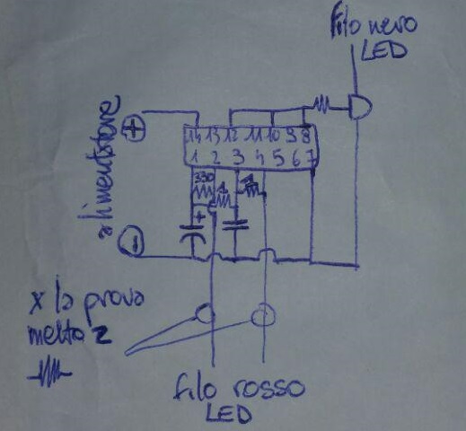 Il LED1 con la resistenza in serie va fra il pin 2 e il meno alimentazione (che noi chiamiamo impropriamente massa).