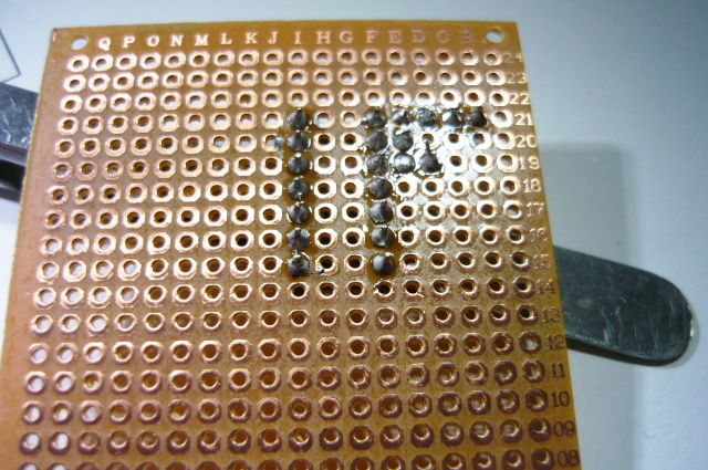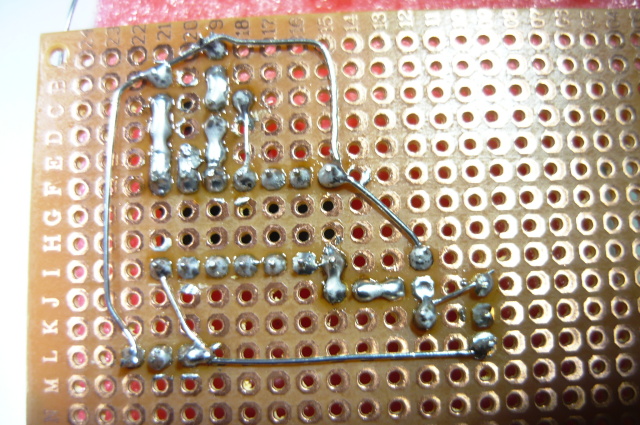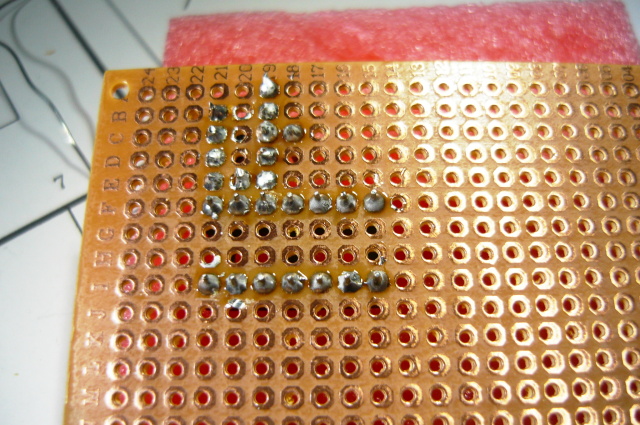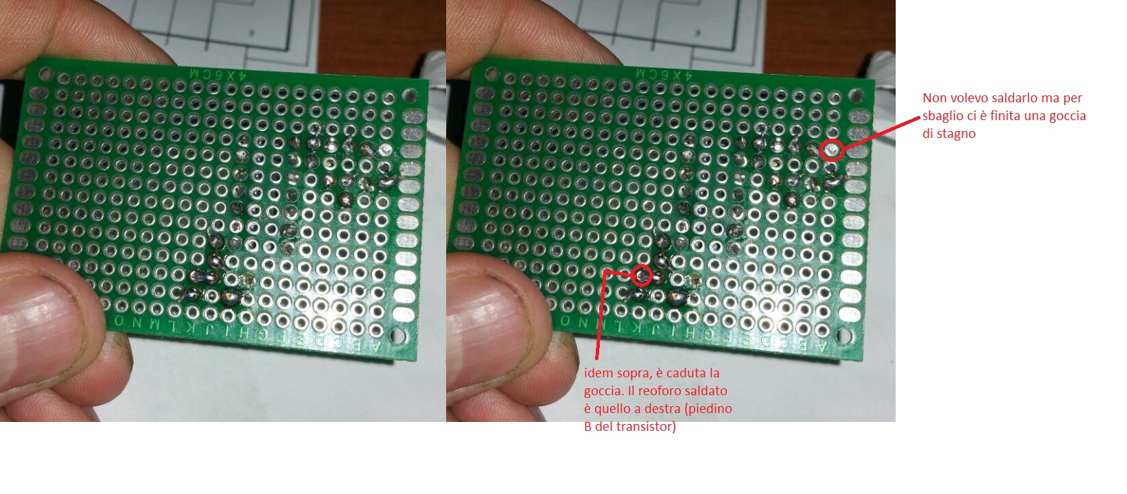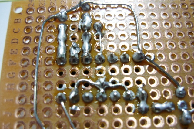 Tutte le connessioni, eccetto l'ultima, sono state effettuate con una goccia di stagno vista la vicinanza tra le piazzole; nel tuo caso usa del filo se non riesci in questo modo.