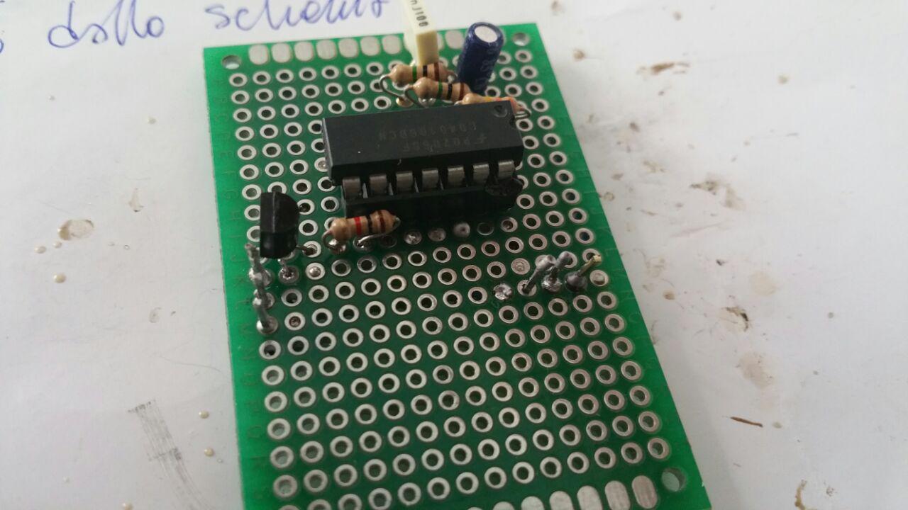 pps. non avevo quei 2 aggeggi a 3 piedini per l'alimentazione, cosi gli ho saldato al loro posto 3 pezzetti (tagliati da un connettore trovato in giro) per simulare ciascuno dei 2 aggeggi.