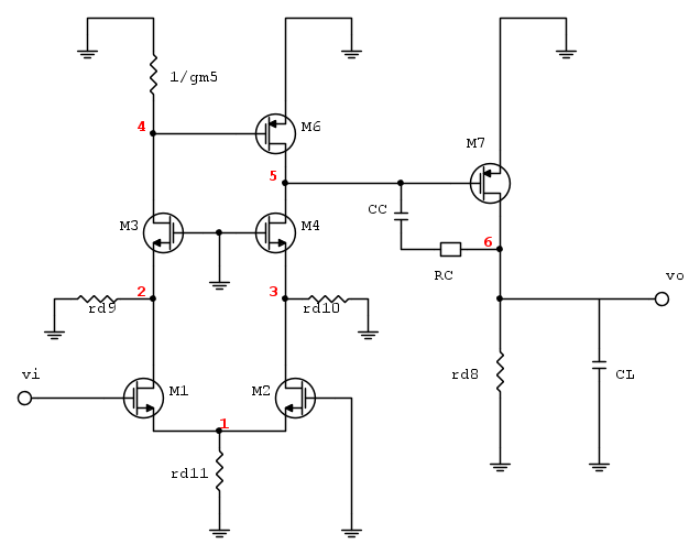 Sfortunatamente le altre resistenze di uscita dei MOS non vengono eliminate dal cortocircuito di uscita, ma sono trascurabili perche' collegate a nodi a bassa impedenza. ro2, ro4 e ro10 sono collegate al source di M, collegate al source di M3, mentre , quindi ad un nodo a bassa impedenza che non viene (molto) disturbato. Discorso analogo per le resistenze ro1 ed ro9, collegate al source di M3, mentre ro3 e` collegata fra due nodi a bassa impedenza (source di M3 e 1/gm5) e quindi non da` troppi problemi.