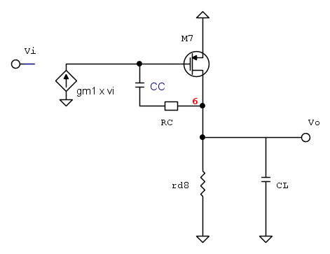 Il valore di RCL con CC in cortocircuito e` piu` facile. Se si considera che RC>>ro6, si ha che il MOS e` praticamente collegato a diodo e la sua resistenza vale 1/gm7. Questa e` in parallelo a r07 e r08, ma sono trascurabili rispetto a 1/gm7, per cui