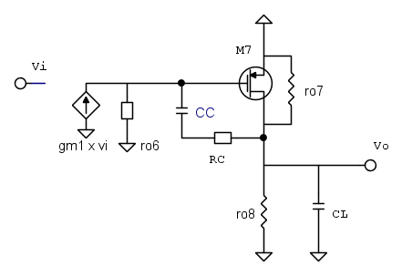 da cui si vede che se RC=0, si ha uno zero a destra dato da gm/CC, se gm RC>>1 si ha uno zero a sinistra a -1/(RC CC) e per il valore di RC=1/gm lo zero va a frequenza infinita, si toglie dai piedi.