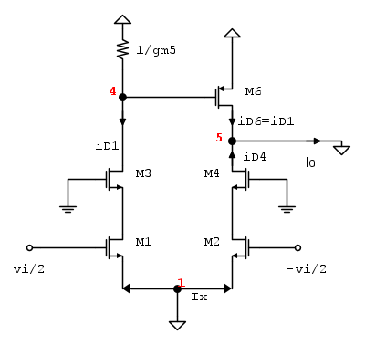 , avendo assunto le gm e le ro di M1 M2 ed M3 uguali. In ogni caso Ro >>> ro6. La corrente Ix1 vale quindi
