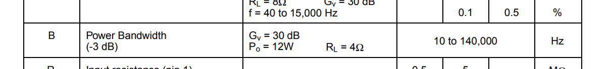 Credo che il datasheet intenda diversamente, cioè che un segnale sinusoidale distorto allo 0.5% si ottiene con una potenza di 8-9W su 8 ohm a qualsiasi frequenza compresa tra 40 e 15000Hz.