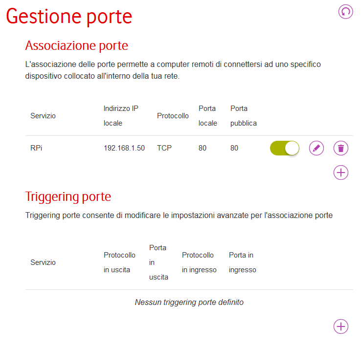 la porta di RPi puo' essere qualsiasi, se stai usando config di default ed è 80 puoi lasciare 80 se vuoi piu riservato puoi dargli p.es la 8080
