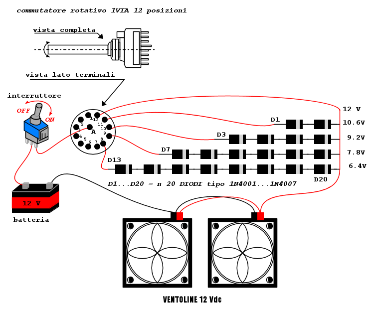 Un amico anonimo, o meglio, un amico Foto Utenteabusivo :-P , suggeriva un modo più furbo di collegare i diodi, cioè in serie a due a due in modo da escluderne o includerne 2 alla volta quando si sposta il selettore di una posizione. In questo modo se ne usano solo 8 su 20 con un risparmio del 60% :shock: sul costo dei diodi quindi ben 12 centesimi di euro! FESTA!!