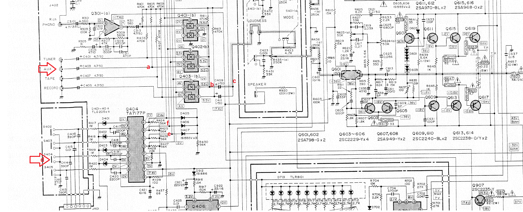 nel TA7177 tra il pin 1 e il pin 7 io misuro 18,2v, così come nei pin di alimentazione dei 3 TA4066.