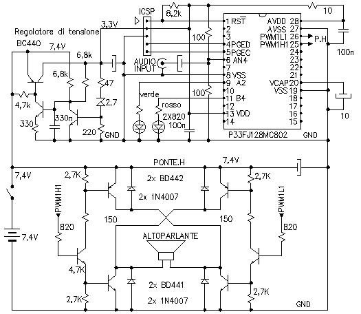 Sull'esperienza acquisita con la regolazione dei motori tramite MicroControllerUnit, si è messo un altoparlante al posto del motore, e aumentata la frequenza di commutazione. La regolazione, anzi in questo caso la modulazione, viene pilotata da un segnale audio prelevato dall'esterno, per esempio dalla presa auricolare di un qualsiasi apparecchio.