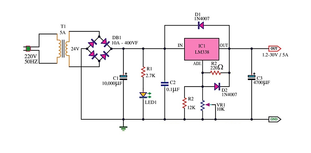 Buongiorno a tutti, ho realizzato un alimentatore da banco, con tensione variabile da 1,2 a 32 volt 5 A mediante l'integrato LM338k. Nel momento delle prove, ho inserito un carico, una lampadina da 12 volt 40 watt, che dovrebbe assorbire meno di 4 ampere; ecco che l'integrato si è immediatamente bruciato. Ho letto che ha internamente una protezione contro i cortocircuiti; mi piacerebbe sapere se ho sbagliato qualcosa. Allego lo schema che ho utilizzato. Grazie anticipatamente per l'attenzione. Fabrizio