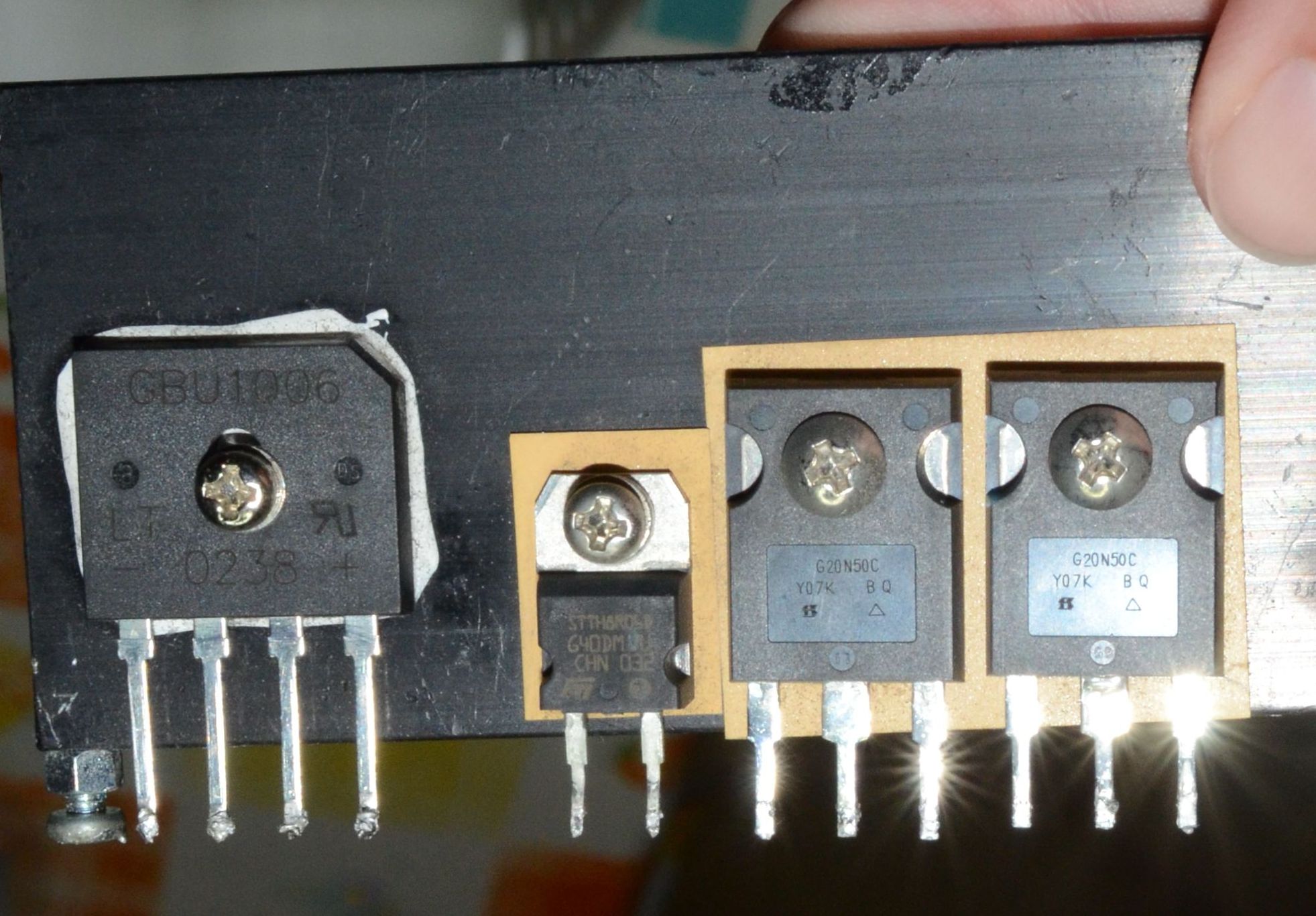 Ho staccato i mosfet che si trovano subito dopo il ponte raddrizzatore e testati con il tester in funzione diodo. Mi sembrano ok seguendo alcuni tutorial su come testare diodi e mosfet i valori sono concordi. Non vi erano mosfet o diodi cortocircuitati. Posizionanto i puntali come ho visto fare su youtube i mosfet/diodi davano dei valori simili a quelli osservati nei viedo.
