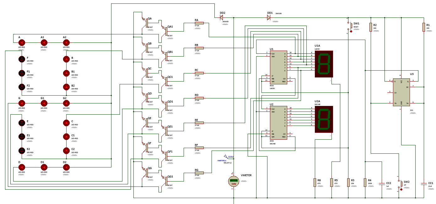 PietroBaima ha scritto:Appunto... Mancano del tutto le resistenze di limitazione fra il decoder/counter e il display, fra U1 e U1A e fra U2 e U2A, per capirci, mentre R5 ed R6 non ci vogliono.