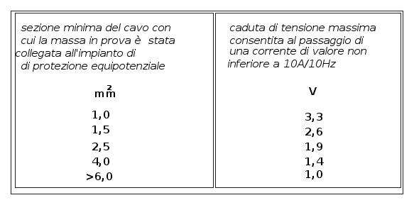 E' mia opinione, o meglio umile conoscenza in merito, che la norma CEI EN 60204-1 relativamente alle prove da eseguire su quadri, circuiti e dispositivi a bordo macchina, indica alcuni tipi di prova, tra cui “ la prova di continuità del circuito di protezione equipotenziale”, che consiste nella verifica del grado di serraggio delle connessioni, nella verifica a vista dell’integrità dei conduttori, e nella verifica strumentale (lo strumento deve fornire una bassissima tensione di protezione, in grado di fornire un’intensità di corrente alternata non inferiore a 10 A -50 Hz- per un periodo di 10 s ) della caduta di tensione fra il morsetto PE ed i vari punti del circuito di protezione equipotenziale , il valore è variabile in funzione della sezione del cavo su cui si sta eseguendo la prova, e deve “essere sufficientemente bassa “ .. ;)