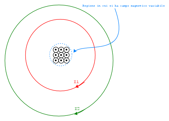(superficie con contorno l'anello verde) sono uguali, allora saranno uguali anche le circuitazioni di campo elettrico lungo entrambi gli anelli; dunque, a parità di conducibilità, sarà uguale pure la corrente perché le cariche nei due anelli, sottoposte allo stesso campo, si muovono allo stesso modo.