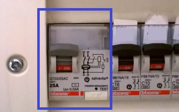 nell'immagine quadrettato di blu si nota il "salvavita" 25A......almeno cosi reca scritto, esso è il solo ed unico presente in tutta l'abitazione.