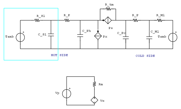 Un modello elettrico equivalente abbastanza semplice lo trovi ad es. qua: Chavez et al., «SPICE Model of Thermoelectric Elements Including Thermal Effects», 2000