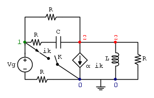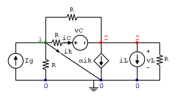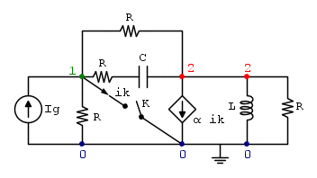 Ecco lo schema. In verità non era neanche questo l'esercizio che dicevo, ma rende comunque l'idea. Si potrebbe trasformare il "lato alla Thevenin" in "lato alla Norton" per avere un generatore di corrente utile. Adesso, la serie tra condensatore e resistore, tenendo conto che la rete prima della chiusura dell'interruttore K è a regime sinusoidale, come va considerata? Abbiamo detto che è sconveniente inserire un nodo nella serie, quindi, se non lo mettessi, e considerassi solo i nodi uno e due indicati, dovrei considerare (solo per quanto riguarda la serie) la resistenza R incidente al nodo 1 e il capacitore C incidente al nodo 2?