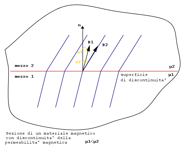 In prossimità della superficie di discontinuità, le linee di campo formano, rispetto alla normale n della superficie stessa, due angoli