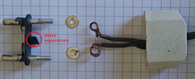 Il componente chiave è il tappo in cartone bachelizzato, munito dei due occhielli metallici. Questa parte assicurava il contatto elettrico stringendo in un unico assemblato conduttore il filo, l'occhiello e lo spinotto.