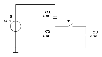 "Dato il circuito in figura, calcolare il valore della carica accumulata su C2, sia con T aperto che chiuso."