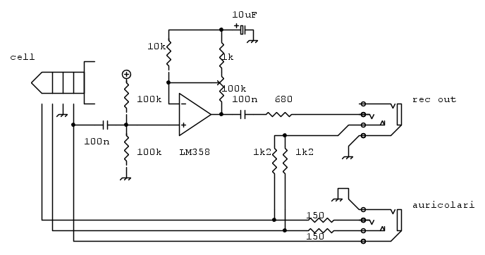 ho aggiunto due resistenze per attenuare il segnale delle cuffie, visto che il volume del cellulare dovrà essere sempre al massimo