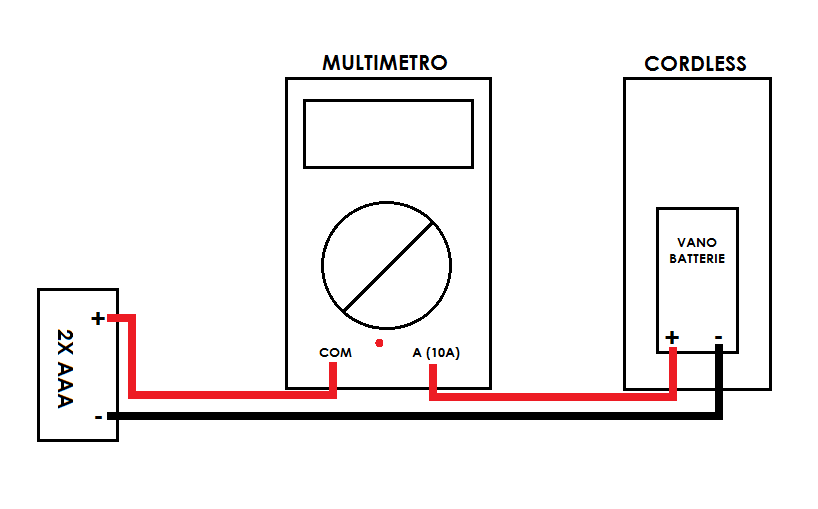Per quanto riguarda la misurazione della corrente assorbita dal cordless sto riscontrando qualche difficoltà perché quando collego il multimetro il cordless si accende per qualche secondo a intermittenza (sia con multimetro impostato su 200mA che su 10A) e ottengo valori compresi tra 20 e 70 mA. Sbaglio qualcosa? Ho tentato la misurazione collegando l'amperometro in questo modo (vedi allegato).