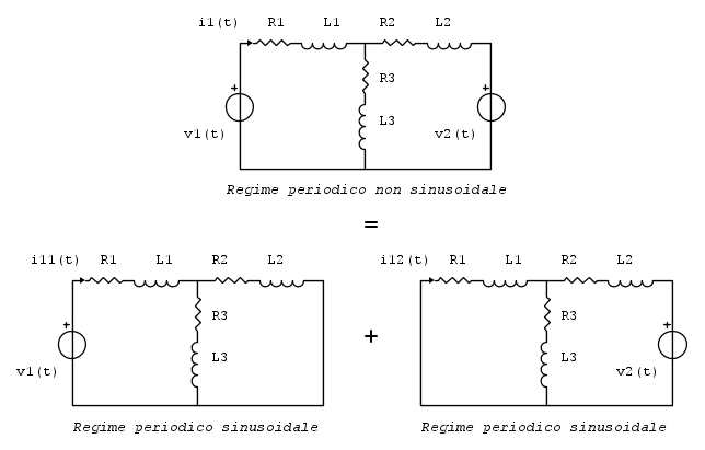 Carico rappresentato dalla resistenza R3 e dall'induttanza L3. Le tensioni efficaci delle fonti