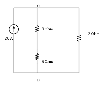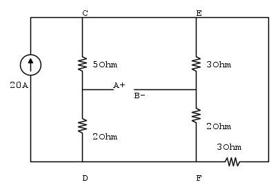 In questo primo esercizio determinando Tensione e resistenza equivalente di Thevenin, ed infine la potenza erogata dal bipolo supponendo i terminali A e B collegati con un resistore da 260mS.