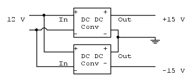 Da quello che ho visto non c'è un converter da 14V a 15V, potrei abbassare con un resistore o con un LM7812 la tensione da 14 a 12V e poi mettere i due converter B1215S come illustrato dal tuo schema?