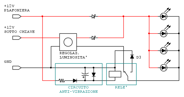 Il regolatore di luminosità è collegato in quel modo perché regola sul negativo, quindi ho portato al positivo dei LED sia l'uscita positiva del regolatore, sia il 12V della plafoniera (ho messo i dui Schottky per evitare ritorni di corrente su regolatore o plafoniera). Poi tramite il relè (comandato dal segnale della plafoniera) vado a commutare tra l'uscita negativa del regolatore (che è quella che regola) e il negativo generale (carrozzeria della macchina).