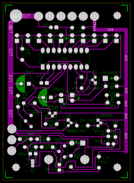Ciao Stefano, purtroppo preso dalla furia di fare questo strumento che mi sarebbe servito per testare i condensatori di basso valore fino a 250v montati su schede caldaie ed altre che spesso vanno in perdita e non ho nessuno strumento per testarli non ho guardato se il circuito era lo stesso descritto in quel forum, per me sarebbe stato un a buona occasione. allego lo stampato fatto da me, le piste sono vicine perche con una fresa da 0.8 imbroglio un po la macchina e mi viene bene. credo che quello nel forum sia l'originale.