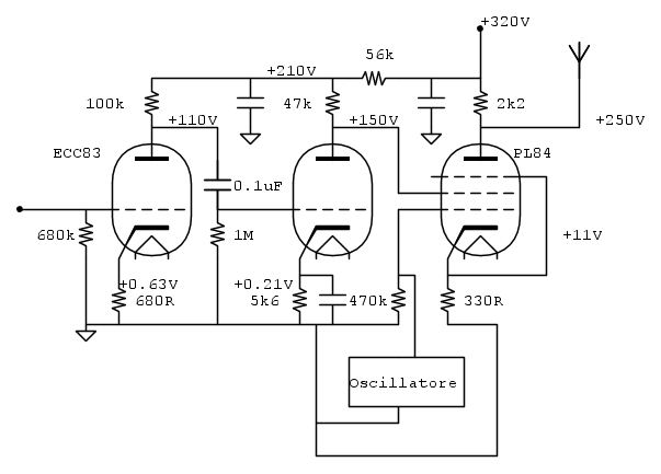 Metterei un condensatore da 1 nF fra l'uscita dell'oscillatore e la griglia controllo del pentodo.