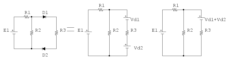 Considerando i diodi come un modello equivalente ideale avresti solo la caduta del diodo quindi se li supponi perfettamente uguali ed ideali non ottieni questo?
