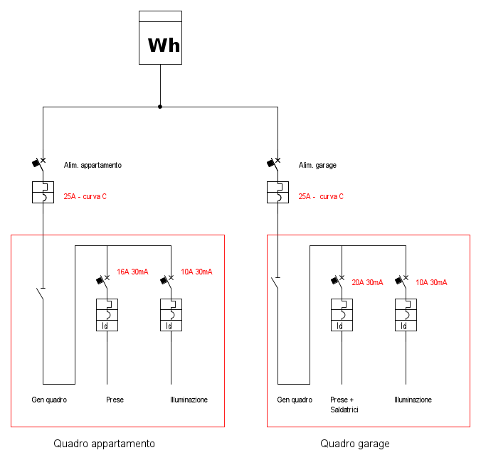 SediciAmpere ha scritto:aggiungerei un magnetotermico differenziale per la sola cucina, dove sono concentrati la maggior parte dei carichi; tieni presente che in garage hai tutte le prese (anche quella da 16A) protette con un C20, in caso di cortocircuito si potrebbero annerire, oltre a non essere a norma in Italia