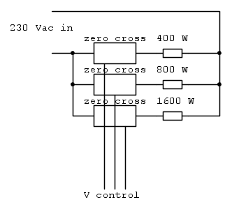 b) con zero crossing: potrei innescarli calcolando per quante semionde devono restare attivi, quindi in 1s avrei 100 semionde e 100 possibili step di regolazione che corrispondono a 30W ciascuno. avrei conunque dei picchi da 3 kW a zero (sempre ragionando in un secondo), non servirebbe una lettura della potenza erogata in quanto gli step sono ben definiti e non ho bisogno di retroazione.