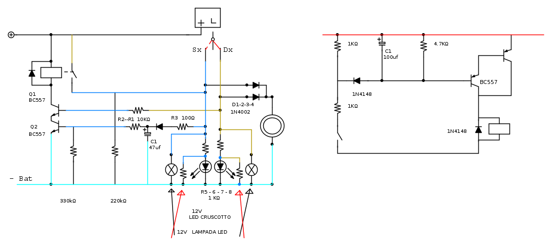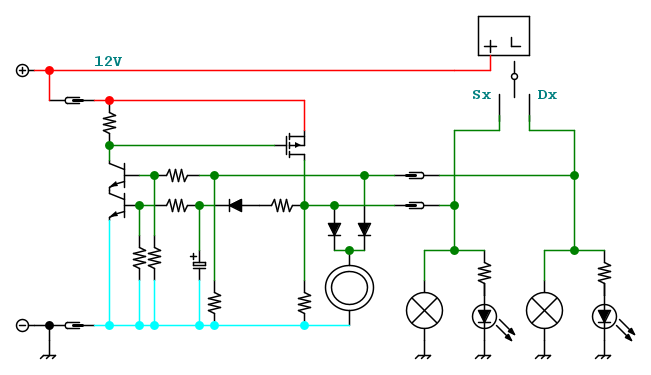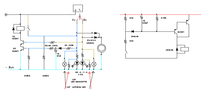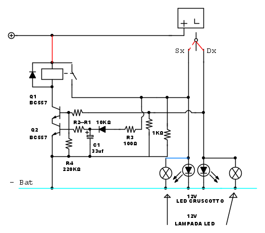 ). Certo li il funzionamento era simmetrico, non aveva importanza quale fosse la prima direzione impostata, bastava subito spostare dall'altra per avere il lampeggio globale. E alla disattivazione veniva comunque portato a termine l'eventuale periodo di acceso in corso (per evitare che i due relé potessero dare in qualche circostanza solo dei brevi impulsi).