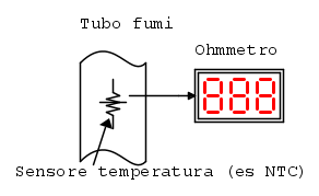 Un sensore di temperatura (es NTC od altro sensore che possa sopportare T > 100 C) e' applicato esternamente o "internamente" al tubo assicurando un buon contatto termico. Internamente potrebbe essere "infilato indietro dall'uscita" del tubo fumi.