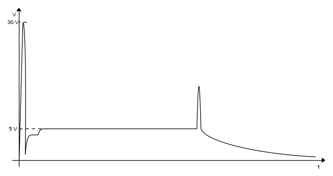 L'andamento della tensione in uscita, basato sui miei arrugginiti ricordi, con picchi all'accensione e allo spegnimento, era questo (non in scala):