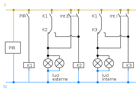 Dello schemino che ho riportato puoi considerare "Int.I", "Int.E" alloggiati nella stessa scatoletta da incasso(tipo E503, presumo) e raggiunti, rispettivamente, da un filo del contatto di "K".