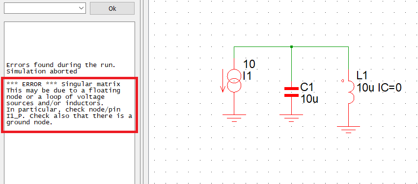 A titolo di esempio ti faccio vedere quello che invece restituisce SIMetrix se gli dò in pasto lo stesso circuito: lui si rifiuta proprio!
